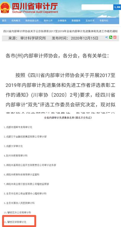 由四川省内部审计师协会主办的“推选内部审计先进”评选揭晓,审计处2020年荣获四川省内部审计师协会授予 “全省内部审计先进集体”荣誉称号。全省内部审计单位中73家获得内部审计先进集体,其中省内高校仅有三家,我校位列其中,充分展示了学校审计工作的水平。