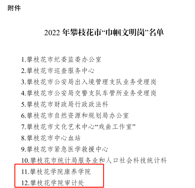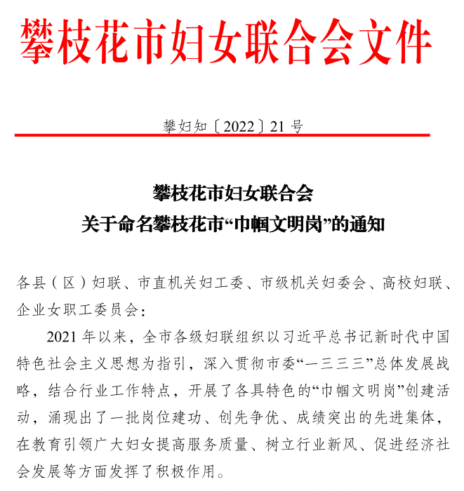 近日,攀枝花市妇女联合会发布《关于命名攀枝花市“巾帼文明岗”的通知》,授予我校审计处“攀枝花市巾帼文明岗”的称号。